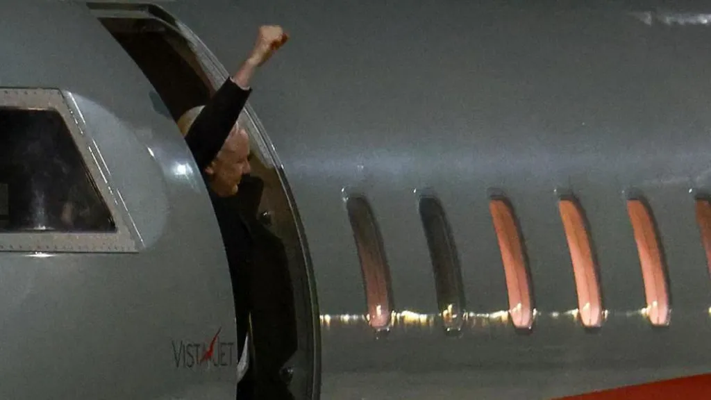 Julian Assange triumphantly lifted his fist in the air and gave his wife an emotional embrace upon setting foot on Australian land for the first time in fourteen years.