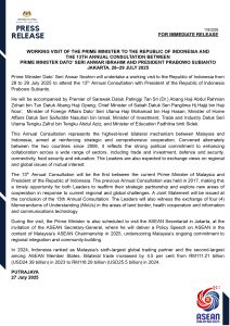 KUALA LUMPUR: Prime Minister Datuk Seri Anwar Ibrahim will undertake a working visit to Indonesia from July 28 to 29, 2025, to attend the 13th Annual Consultation with Indonesian President Prabowo Subianto.